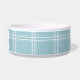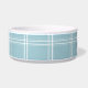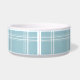 This ceramic dog food bowl has a preppy blue and white plaid stripes pattern in the background. In the middle, there is a large white bone with an easily customized name of your doggie written in blue.