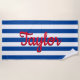 This beach towel features blue and white stripes. Personalize this beach towel with your name or text of your choosing which appears in large red font across the length of the towel.