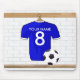 A unique sports design with a blue and white soccer jersey with a soccer ball hanging in a locker room which is fully customizable with your own name and number. An ideal personalized gift for any soccer player or soccer fan.