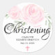 Two soft pink watercolor roses nestled in sage green leaves create a beautiful floral pattern. A soft pink cross is placed at the bottom of the christening sticker. The word Christening is written in a large flowing script. The name is written in a simple font. Her first name is on the top and her middle and family name is on the second. The date follows.