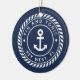 Create a unique boat keepsake with this custom photo ornament featuring your boat name and ship's registry in white lettering on a nautical rope badge with an anchor illustration in the center, on a navy blue background. Add a photo of your boat to the reverse side.