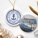 Create a unique boat keepsake with this custom photo ornament featuring your boat name and ship's registry in navy blue lettering on a nautical rope badge with an anchor illustration in the center. Add a photo of your boat to the reverse side.