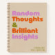 Unleash your creativity with this personalized notebook, featuring bold, retro-inspired typography that declares "Random Thoughts & Brilliant Insights." Designed with a neutral beige background and vibrant accents of purple, orange, and green, this notebook is as stylish as it is functional. Whether you're jotting down ideas, writing your next big project, or organizing your daily thoughts, this notebook fits the task. Available with lined, blank, graph, or dotted pages, it’s perfect for students, professionals, and creative minds alike. Customize the name for a personal touch and make it a thoughtful gift for writers, thinkers, or anyone who loves unique stationery.