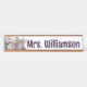 I was very pleased when I received my name plate. The brightness of the yellow caught my eye immediately because it was so true to color of the picture. The sturdiness of the material lets me know it won’t get bent or broken easily. The sturdiness of the card stock is a plus as well. The colors even on the chalkboard and apple are true to life colors. The apple looks like you can take a bite out of it.