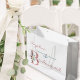 Personalized wedding gift bag for your bridesmaid. This elegant floral design is lettered in shades of dusty rose pink, hunter green and ivory. It features a pink glitter "B", embellished with a pink and ivory bouquet of watercolor flowers and foliage. The template is set up for you to also add the bridesmaid's name, the bride and groom's name and wedding date. The wording on the front reads "[name] thank you for being my bridesmaid" in classic typography and handwritten script whilst the back has a single bouquet, bride and groom names and date of wedding. Please browse our store for coordinating items.