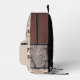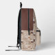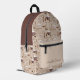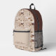 This fun printed backpack features a collage pattern of coffee cups and terms in brown and white on a beige background. Add your name to personalize. Perfect for the coffee lover.