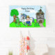 Little brown haired Prince with crown and sword, and his pet horse, dragon and frog with a castle and tree with an owl in the background, personalized Birthday banner.