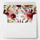 Sending out a beautiful wedding invitation ensemble is easily achieved with these personalized envelopes with an inner pattern of burgundy, pink, wine, red, and cream watercolors flowers with green leaves and multi-coloured stems. The back flap has another floral bouquet and personalization of names and addresses in burgundy and gold in two different fonts.