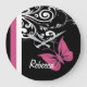 Striking black, white and cranberry pink design featuring an pink butterfly against a black background with pretty white floral swirls. There is a pink and white stripe to the side of the design to add an extra bit of colour against the black background. Customizable text is included to add the name of the butterfly lover.
