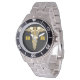 Unique caduceus in ivory, periwinkle, sage & gold in a style inspired by the Arts & Crafts movement is balanced by 2 custom text fields for your initials at 9:00 & 3:00, all set against a solid black face. Together w/ this elegant stainless steel band & adjustable black bezel, it's perfect for the doctor, nurse, or other medical professional in your life!