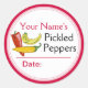 These personalized round canning stickers will fit on top of your glass jam, jelly, and preserves jar lids. They have an image of a three chili peppers.