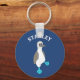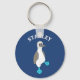 Create a cute keychain that's perfect for bird lovers. This personalized keychain features a cartoon style illustration of a blue-footed booby bird against a blue background and is ready to be personalized with a name or other text in white lettering.