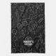 Modern black kitchen towel with white hand-drawn utensil icons and a bold “Your Name’s Kitchen” mark. Personalize the name for a stylish, chef-worthy accent or gift for home cooks.