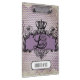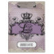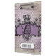 Beautiful vintage design features a clipboard with a purple chevron striped background with a black regal design banner with a crown and decorative swirls with text that reads Live Simply Laugh Often Love Deeply. It also has a black and white vintage style banner that you can easily add your name to personalize!
