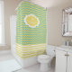 Shower curtain with chevron stripes of aqua and yellow with a bottom border of chevron in yellow and white stripes. You can add your name easily to personalize this chevron stripe shower curtain.