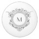 Pretty and chic decorative illustration with circular frame embellished with scrolls of flowers and leaves, crowned with a honey bee in antique white and grey tones