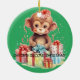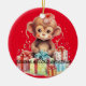 This is a personalized collectable Christmas ornament to commemorate a child's second Christmas. It has an optional red velvet pouch for safe keeping or gift giving. It is ceramic and it features an adorable monkey on each side. One side has a red background while the other side has a green background. Both sides are personalized.