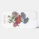 Old-fashioned botanical illustration of China asters in pink, white and blue.