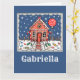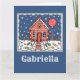 A colorful illustration of a festive gingerbread house. The outside of the house is decorated with two candy canes and has a large lollipop tree in the garden. The ground is covered in bright white icing sugar snow and strewn with sweets.