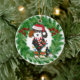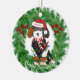 Cute Personalized Black/Tan/White Cartoon Bernedoodle Puppy wearing Santa hat, red and white striped scarf, wrapped in christmas lights. Festive christmas wreath border. Add your bernedoodle's name to this adorable holiday ornament!