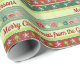 You can personalize this Christmas wrapping paper with your own greeting or name. You can also remove it entirely by deleting the "Customize Here" text. The design features red and green ribbons with illustrations of wrapped packages and snowflakes.