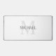 features personalized name in grey and monogram in light grey as background, in classic serif font style,