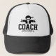 Personalized coach hat for official sports teams supervision. Handy for soccer, basketball, softball, baseball, lacross, water polo, football, rugby, volleyball, handball, tennis and other sports that need an umpire. Great for High School games, college leagues and tournament matches. Personalize with custom name, team, trainer, school etc. Black and white or custom colour trucker hat.