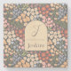 Add charm and character to your tabletops with this personalized stone coaster set, featuring a whimsical pebble-style floral pattern in warm shades of red, orange, beige, and blue. Centered on each coaster is a customizable label where customers can add their initial and family name, making this set a thoughtful gift or stylish addition to any home.