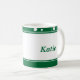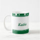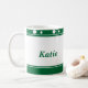 To change colour of stripes and text colour on mug, click the "Customize" button, then clicking "Edit">>"Background", select a colour for the stripes. For text colour, click on the name to activate it and select a colour by click the small colour box.
