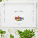 Design features a white background to the image of a cluster of colourful fruit as main design. Customizable forest-green text is displayed above in an elegant font. A lovely blue flourish borders the edges. Designed to coordinate with the Colourful Fruit-Themed Kitchen collection. Also available in blue.