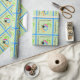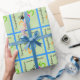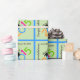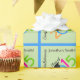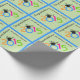 This brightly coloured gift wrapping paper features a graduation design. Customizable text reads: Congratulations (personal name)! and Class of 2015 with a mortarboard sitting on top of the "0". The background is light green and bright blue. This wrapping paper is accented with orange, blue, pink and lime green.