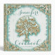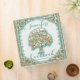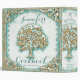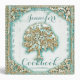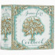 An antique gold and teal look personalized cookbook featuring a family tree design in gold. Art by Amelia Carrie