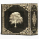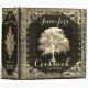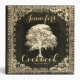 An antique leather look personalized cookbook featuring a family tree design in gold. Art by Amelia Carrie