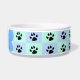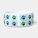 This attractive personalized custom male dog bowl features a chequerboard design of paw prints in an alternating pattern of blue and green with a big blue dog bone on top. The design becomes a custom boy dog bowl when you put your dog's name on the bone. Copyright Kathy Henis