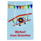 Here's a cute gift bag that you may personalize for a little boy. It features a colourful airplane image with a pennant banner above it. Colours used are bright red, blue, green, and gold. Below the image is your custom text in bright red, and placed on a light blue background. The back of the bag repeats the image and has an additional text for you to customize. Perfect for a little boy's birthday, but you may change the text for any occasion.