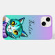 Add a name to this Teal, purple, pink and blue kitty cat with yellow eyes phone case.