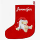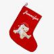 A christmas stocking with an illustration of a cute little Christmas snow creature, toy doll, wearing a red santa hat. The little snow monster has a pull string to make him talk and he is covered in soft white fur with light brown accents. Background is the colour red. Personalize with a name.