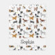 A design for dog lovers. It features illustrations of golden retrievers, border collies, Jack Russell terriers, spaniels, basset hounds, beagles, Dalmatians, golden doodles, Labrador retrievers, and mixed breeds. Personalize with the name of your choice, which will appear in a fun, black font.