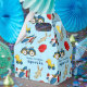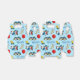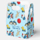 Fun and colourful kids birthday party paper favour box featuring a cute kids toys pattern including duck, car, airplane, stuffed animal bunny and balloon on textured light blue background. Personalized with kid’s name.