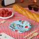 Fun and colourful kids birthday party paper bowls featuring a cute kids toys pattern including duck, car, airplane, stuffed animal bunny and balloon on textured light blue background. Personalized with kid’s name.