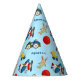 Fun and colourful kids birthday party hat featuring a cute kids toys pattern including duck, car, airplane, stuffed animal bunny and balloon on textured light blue background. Personalized with kid’s name.