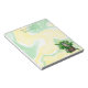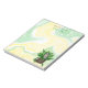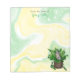 Personalized notepad with an adorable hand drawn grey kitten sitting in an antique bucket of catnip. Green and yellow marble background.