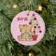 Personalized Cute Orange Tiger Cat and Holiday Christmas Tree on a Pink Background Ceramic Ornament
