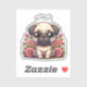 Cute chibi cartoon cozy little pug puppy dog sitting in pink flowers with a name that you can add in the personalize area.