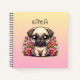 Personalized girl's notebook. Cute chibi cartoon cozy little pug puppy dog sitting in pink flowers with a name that you can add in the personalize area.