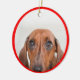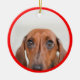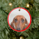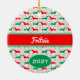 The front of this dachshund photo Christmas ornament is customized with a photo of your dog or dogs framed in a red border. On the reverse is a fun print with red and green sausage dog pattern and a polka dot background. A wide red stripe with a green and white border features your personalized dog or dogs names. A green oval displays the year. A memorable keepsake gift for dachshund moms and dads to treasure every holiday season.