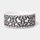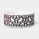 This ceramic dog food bowl has a stylish black and white damask swirl pattern in the background. In the middle, there is a large red bone with an easily customized name of your doggie written in white.
