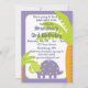This customizable dinosaur birthday party invite features a dinosaur with hearts on it's back between two palm trees.