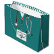 Creative medical school graduation gift bag for doctor graduate featuring hospital scrubs and stethoscope. Edit text to add doctor, physician assistant or nurse's name and medial credentials.
