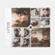 A simple and cute custom dog photo collage and name fleece blanket featuring ten photos, your dog's name in a modern font and a paw print in the centre all set against a white background. Simple to customize by adding ten of your own photos and your dog's name, the background and text colour can also be changed if preferred.